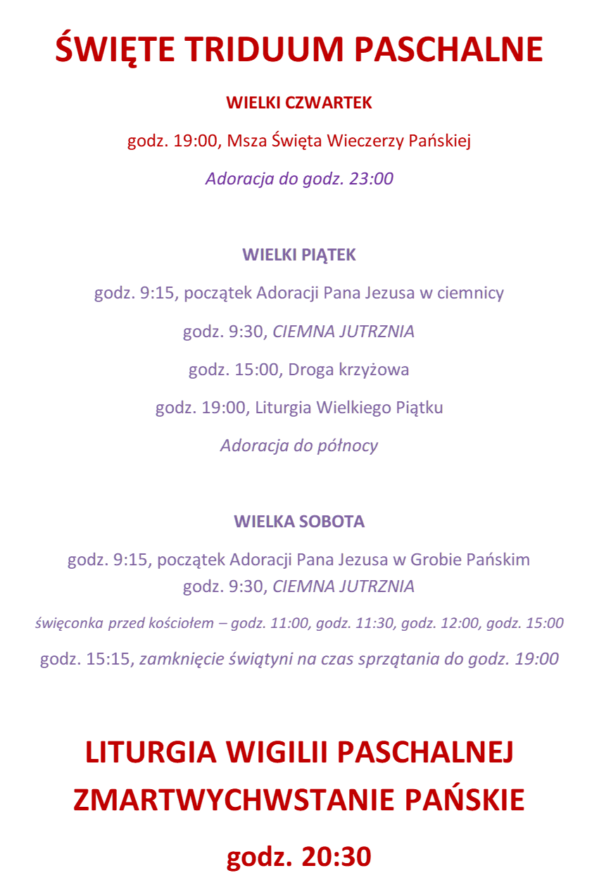 w godz.: 11:00 – 12:00; 15:30 – 17:00; 19:15 - 20:30. - TRIDUUM PASCHALNE: