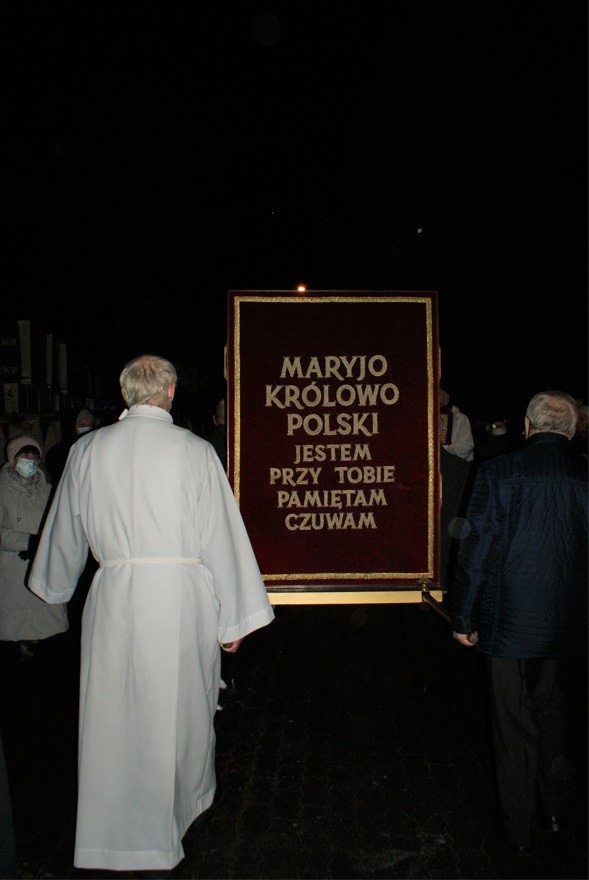 Ok. 17.30 witaliśmy już Matkę Bożą, która przyjechała do nas z Wierzenicy z parafii św. Mikołaja, z proboszczem ks. Przemysławem Kompfem. Zabrzmiały uroczyste famfary i procesja wyruszyła do kościoła. Obok służby liturgicznej, towarzyszyli nam harcerze z ZHP, sztandary z grup duszpasterskich, delegacja pracowników z Zakładu Karnego i siostry Albertynki.