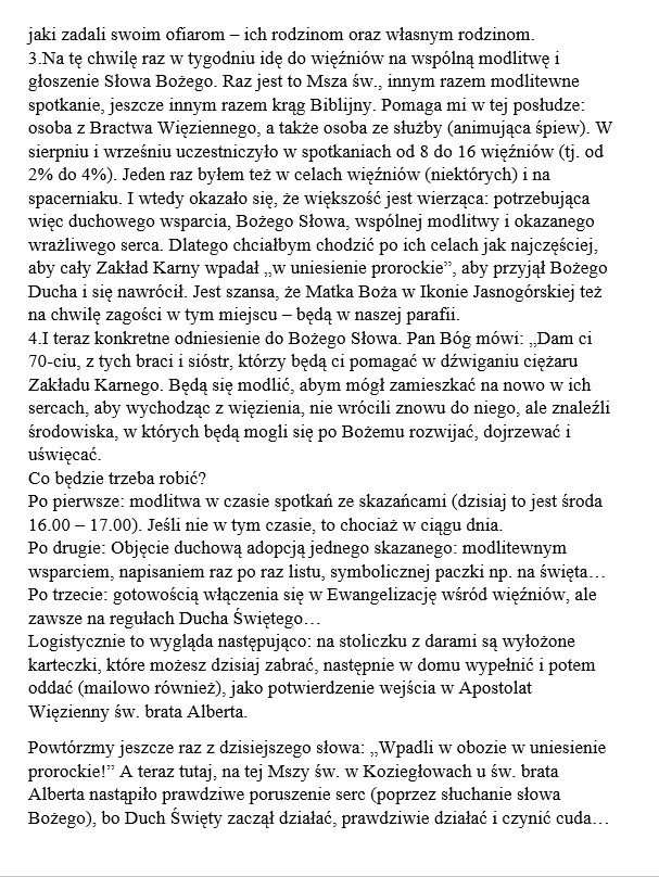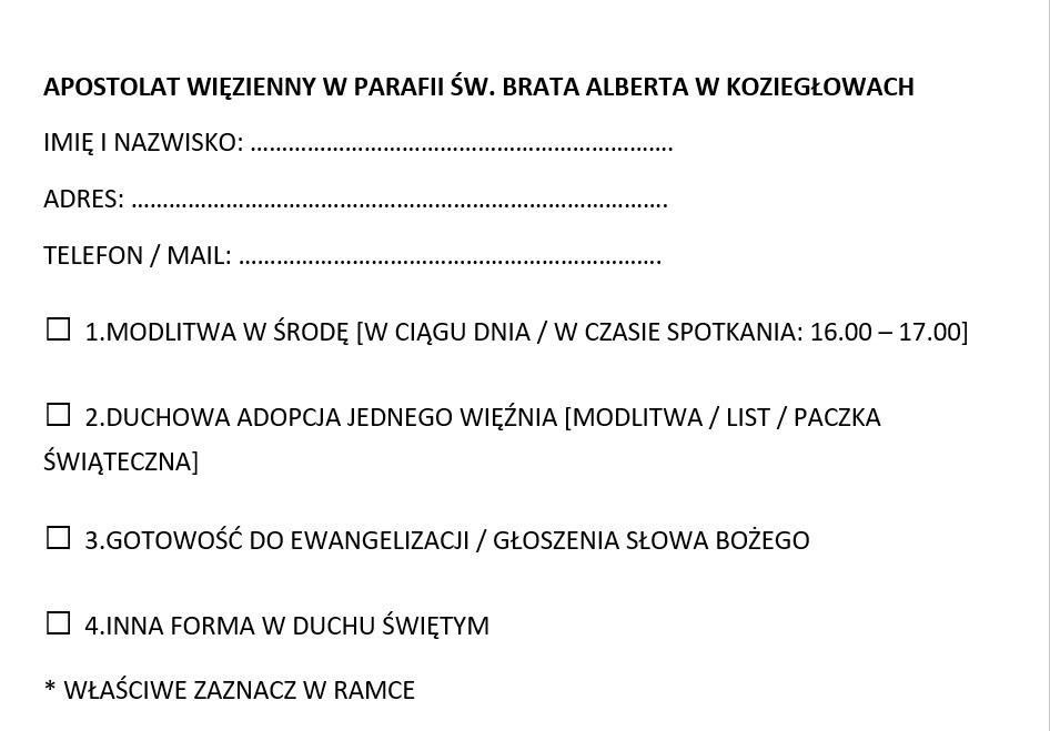 Do Apostolatu może należeć każda osoba, której zależy, aby Słowo Boże docierało na peryferie grzesznego świata, także do serc więźniów Zakładu Karnego w Koziegłowach. Ksiądz proboszcz Tomasz Sobolewski od 1 sierpnia 2021 r. oprócz posługi w naszej parafii, został kapelan tegoż Zakładu Karnego. Zależy mu na tym, aby w tej posłudze zaangażowana była "cała Boża Armia", ponieważ duchowe potrzeby skazanych są przeogromne i nie wystarczy jedna osoba, aby katechizacja i ewangelizacja była skuteczna. W tej posłudze ważna jest, chęć niesienia pomocy więźniom, w sposób pokazywany przez Ducha Świętego. W Zakładzie posługiwał będzie ks. Tomasz, pomagać mu będą osoby z Bractwa Więziennego, ale cała rzesza wiernych (w domach) może wtedy się modlić, aby skuteczność działania Ducha Świętego przez te osoby była jak największa. Chodzi o to, aby więźniowie byli gotowi uczestniczyć w spotkaniach modlitewnych, wchodząc na drogę nawrócenia i współdziałania z Duchem Świętym. Aby później sami stawali się świadkami ogromnego działania Mocy Bożej w ich sercu. Nie ma bowiem skuteczniejszej ewangelizacji wśród więźniów - od samych byłych skazanych! Oto możliwości działania w Apostolacie Więziennym św. brata Alberta:
