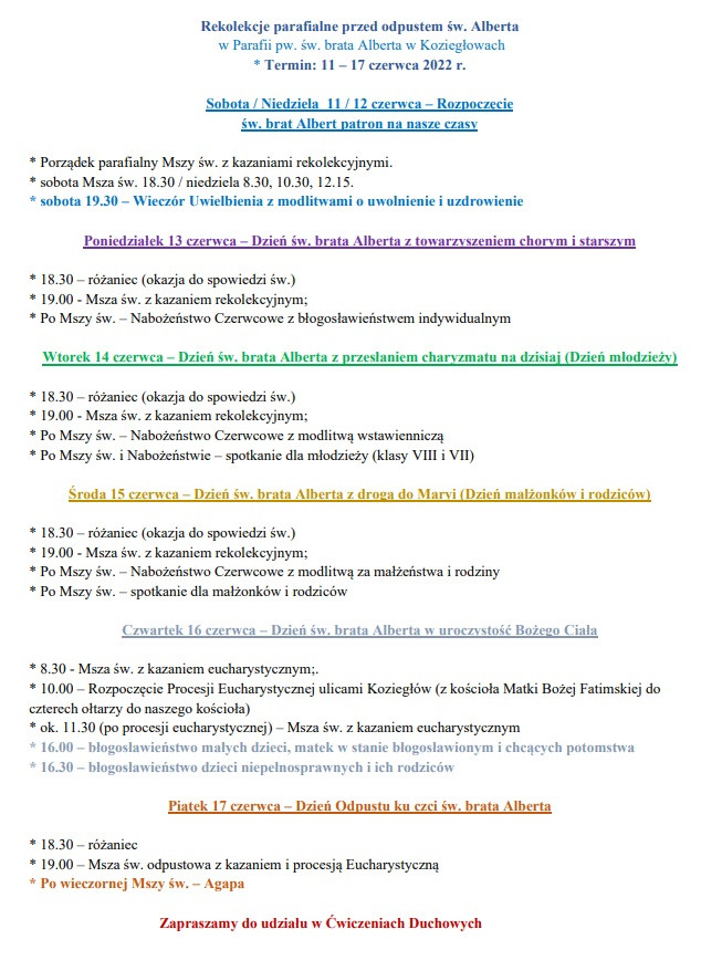Rozpoczęliśmy Rekolekcje parafialne przed odpustem. Uwielbienie z św. bratem Albertem po Mszy św. wieczornej (w sobotę). Codzienne Msze św. z Nabożeństwem Czerwcowym o godz. 19.00. Okazja do spowiedzi św. codziennie od godz. 18.00 (do godz. 19.00). W poniedziałek modlitwa za chorych i samotnych. We wtorek za młodych z młodymi (klasy VIII i VII). W środę dla małżonków i rodziców – ze spotkaniem.
