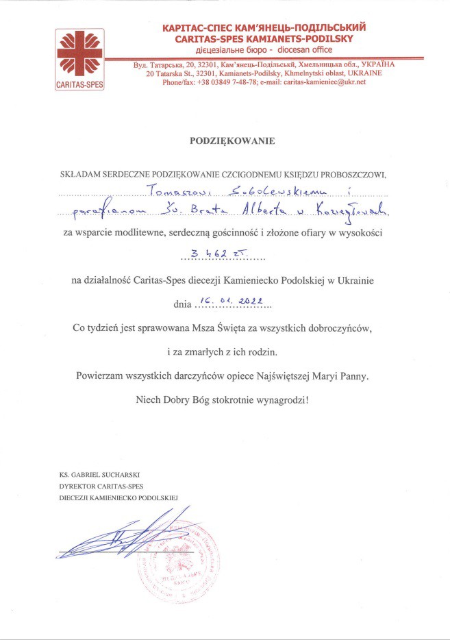 Ks. Gabriel pracuje w Caritas diecezjalnym, a mając obywatelstwo ukraińskie, jest Polakiem, mając jeszcze korzenie ormiańskie. W sobotę i niedzielę (15/16 stycznia) na Mszach św. głosił Słowo Boże, zatrzymując się nad Jego mądrosćią, a także dzieląc się sytuacją Kościoła w swojej Ojczyźnie. Została też zebrana ofiara na rzec Caritasu w diecezji kamieniecko - podolskiej (3462 zł.). W zdjęciach list podziękowania z Caritasu diecezji kamieniecko - podolskiej.